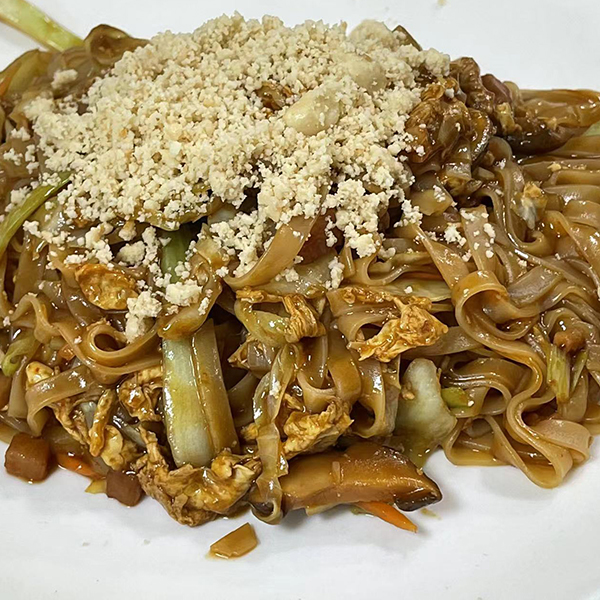 Tallarines de arroz ancha,bacon, huevo, langostinos, verduras, cacahuete, lima y salsa tamarindo