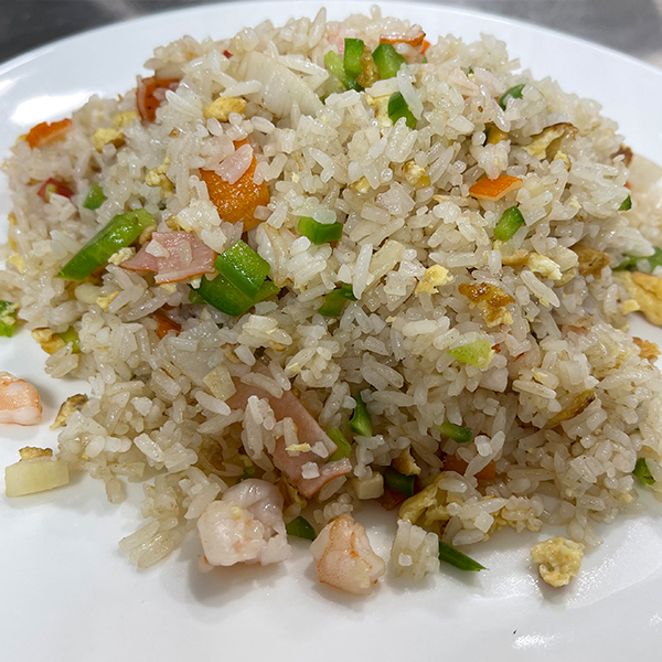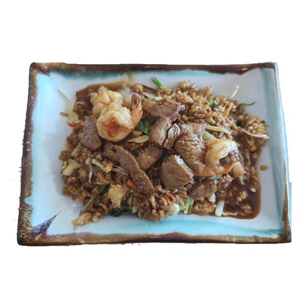 Arroz blanco con pollo tepanyaki y salteado.