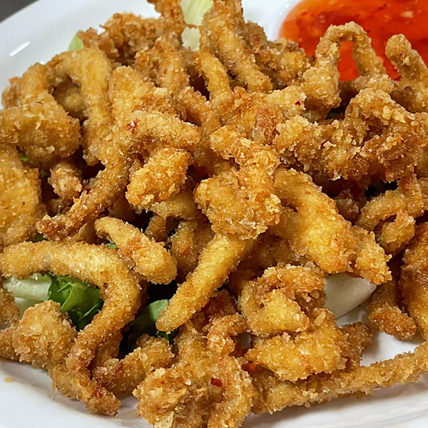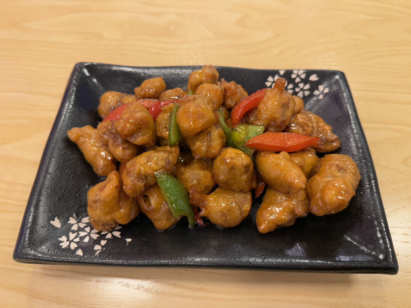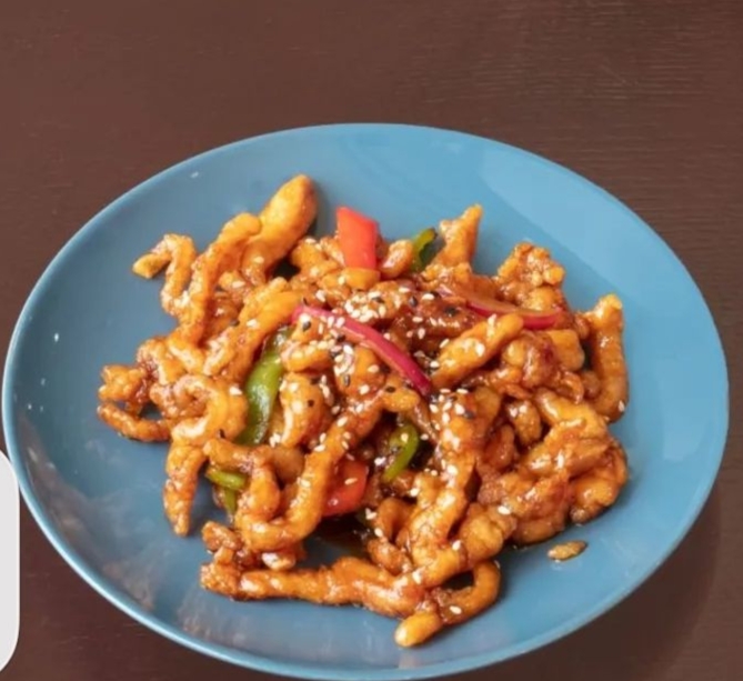 Lomo de cerdo a trozos rebozado y envuelto con salsa agridulce.
