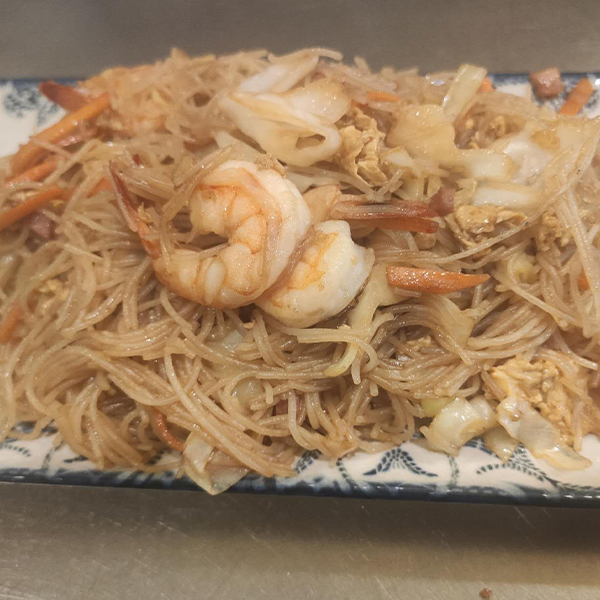 Fideos gruesos de arroz , salteados con langostinos verduras y trocitos de bacon